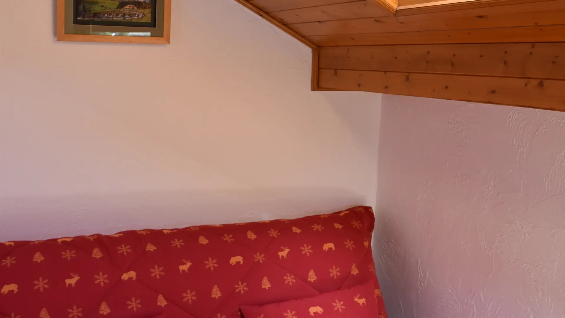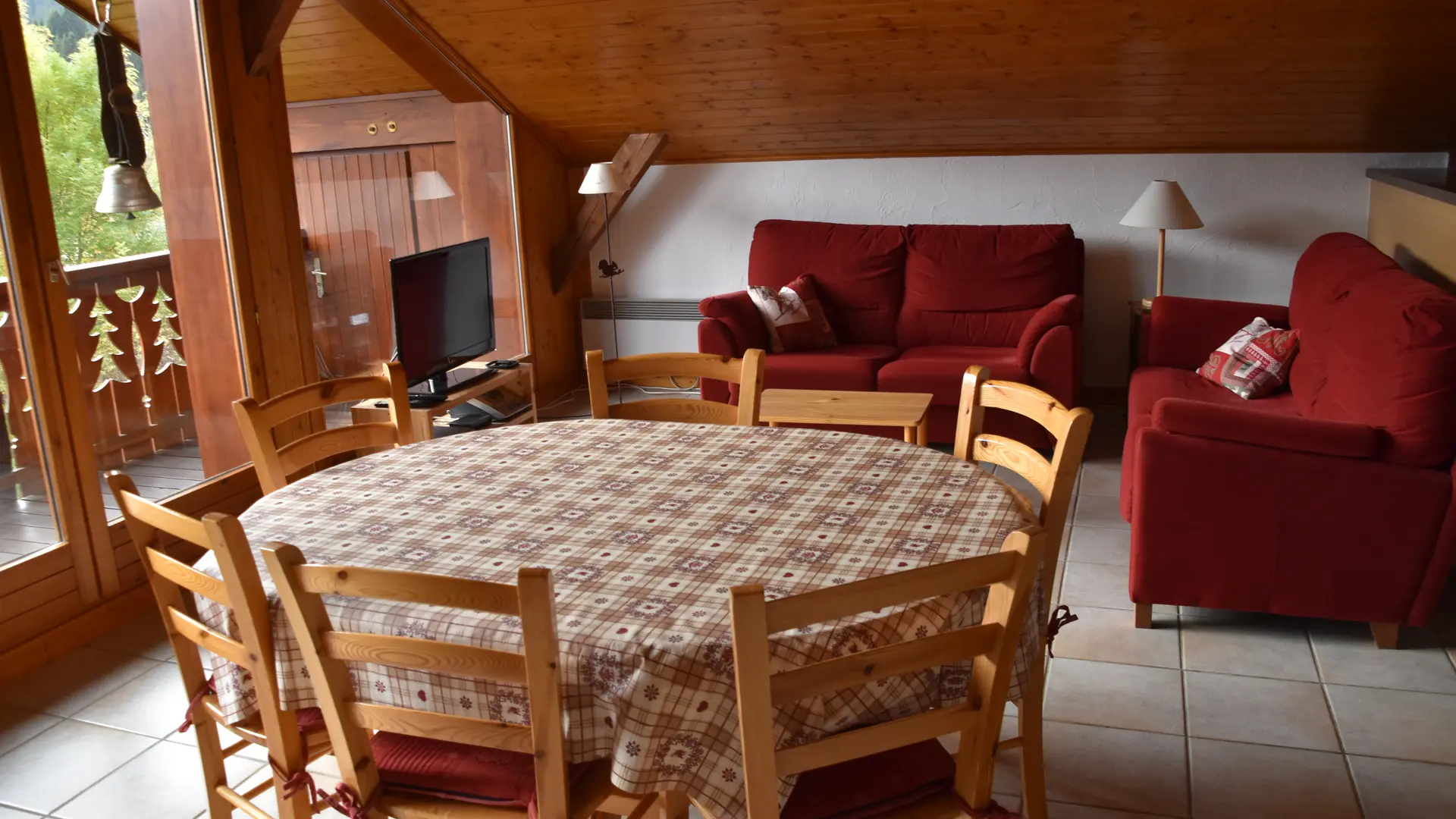 Séjour mansardé et lumineux avec poutres apparentes et accès direct au balcon, coin repas, salon avec TV et lecteur DVD.
