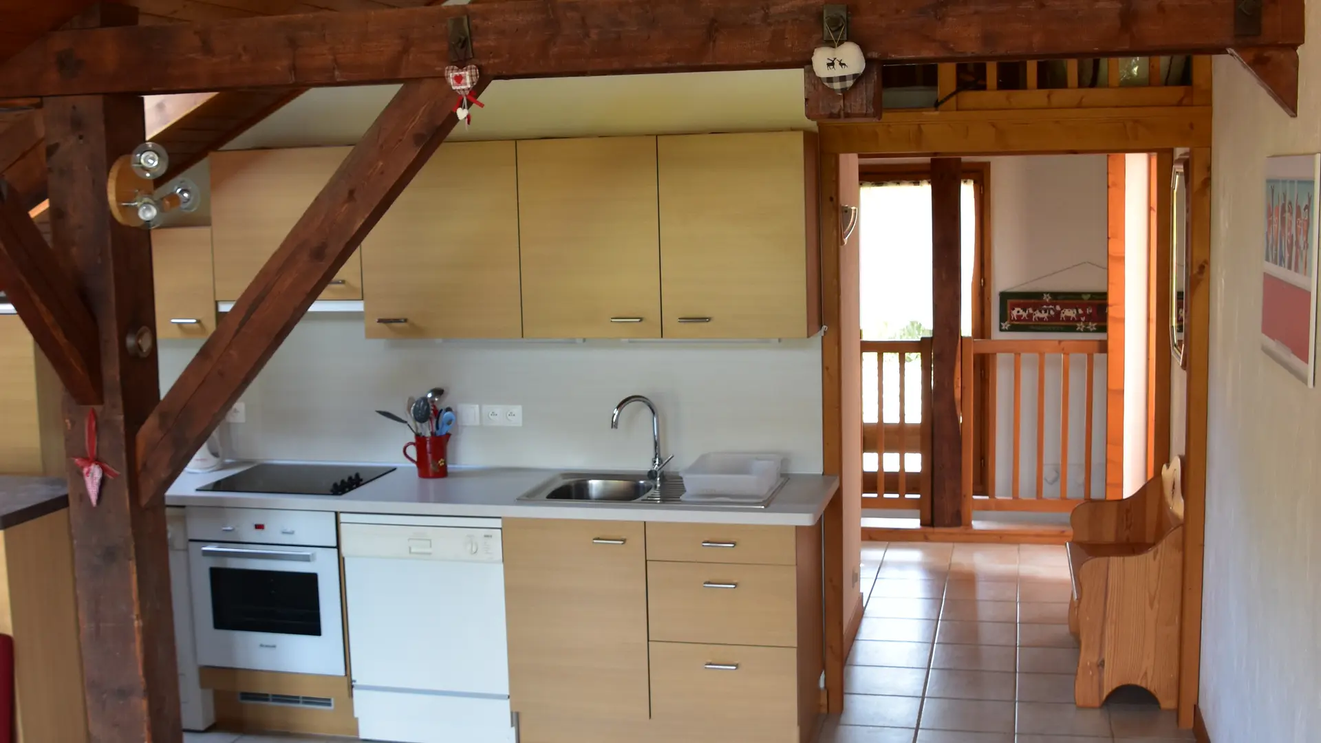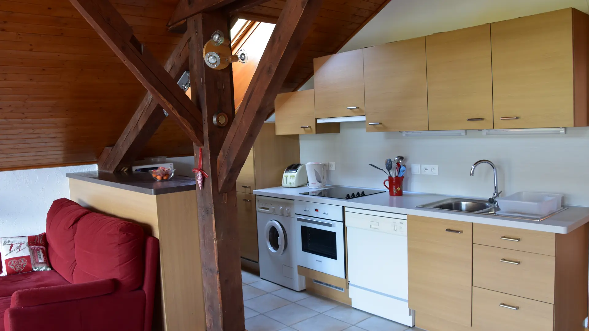Cuisine : four et micro-ondes, 1 grand réfrigérateur de 184L avec un compartiment congélateur de 18L, lave-vaisselle, 4 plaques vitro céramiques, machine à café Nespresso (capsules), machine à café filtre, appareils à fondue et raclette.