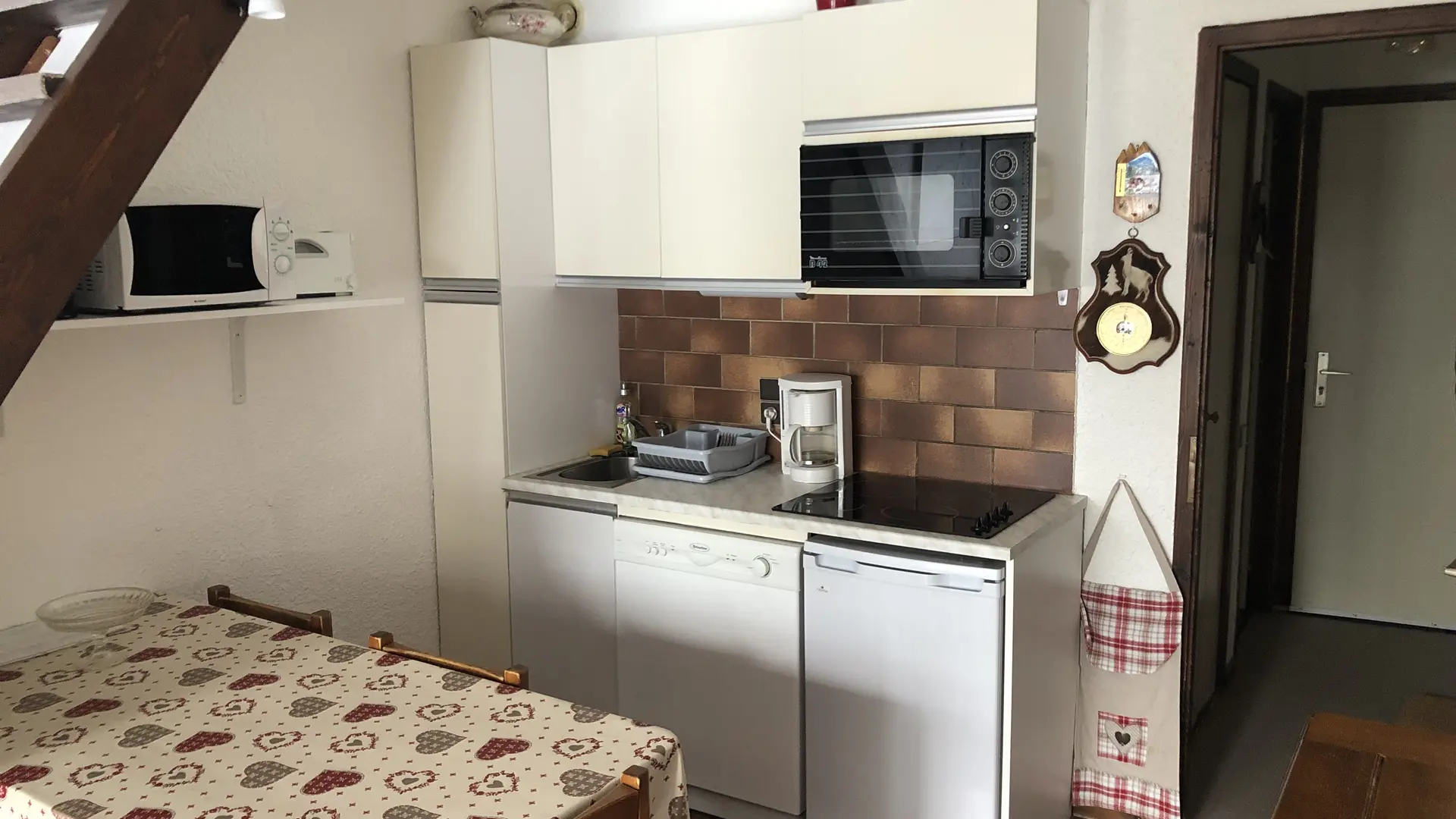 Coin cuisine équipé : micro-ondes, mini four, 4 feux sur plaque induction, cafetière, lave-vaisselle, vaisselle, couverts et ustensiles...