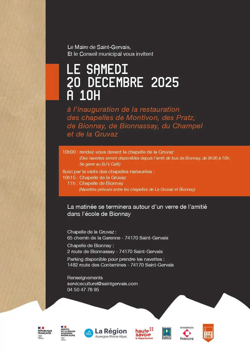 Venez assister à l'inauguration de la restauration des chapelles de Montivon, des Pratz, de Bionnay, de Bionnassay, du Champel et de la Gruvaz